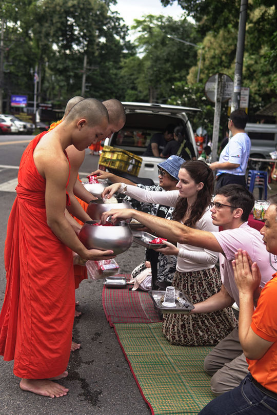 Sacred Alms Giving: Witness monks collecting alms at Doi Suthep’s foothills — a serene glimpse into Thai Buddhist life.